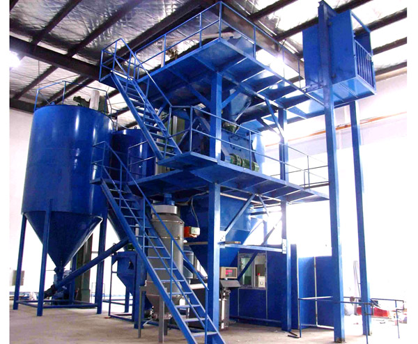 主要配置:原料倉,自動計量配料及稱重裝置,斗式提升機(jī),待混倉,高效混合機(jī),喂料機(jī),成品倉,自動稱量包裝機(jī),脈沖除塵器,支架爬梯平臺,電器控制柜等組成。